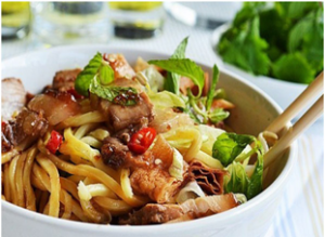 Cao lau is eaten with lots of herbs and vegetables which greatly enhance its flavors.