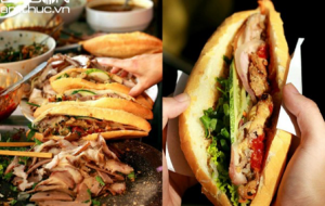Or, if you prefer different fillings rather than the traditional mix of pâté, pork, cha lua (kind of pork bologna), vegetables, and sauces, you can check out banh mi stuffed with roasted pork at Minh Thu bakery at 248 Ly Thuong Kiet Street….