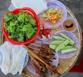 The dish is served on a tray consisting of a stack of wet rice pancakes, skewers of charcoal-grilled pork, a dish of fresh herbs and vegetables, and peanut sauce as a dip.